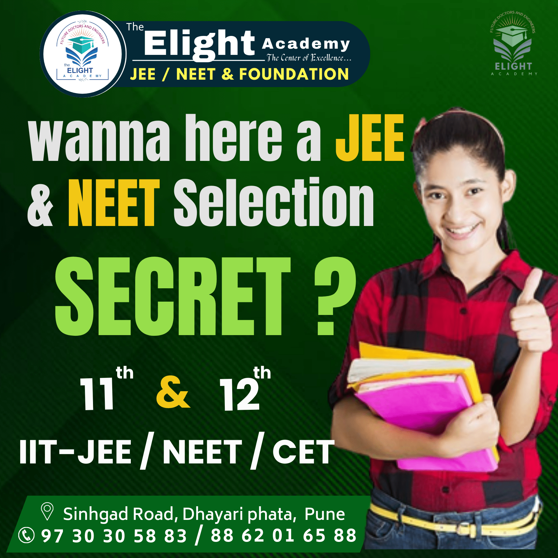 At The Elight Academy, we are dedicated to fostering scientific curiosity and academic excellence. Our mission is to provide top-tier science coaching to students at all levels, helping them achieve their educational and professional goals. With a team of experienced educators and a robust curriculum, we stand as a beacon of learning in the field of science. Why Choose Us? Expert Faculty Our faculty comprises highly qualified and experienced educators who are passionate about teaching. Each member of our team brings a wealth of knowledge and a commitment to student success. Comprehensive Curriculum We offer a wide range of courses designed to meet the diverse needs of our students. Whether you are preparing for school exams, competitive entrance tests, or higher education, our meticulously crafted curriculum covers all aspects of science education. Personalized Learning Understanding that every student is unique, we provide personalized learning plans tailored to individual needs. Our approach ensures that each student receives the attention and resources they need to excel. State-of-the-Art Facilities Our academy is equipped with modern laboratories, a well-stocked library, and advanced learning tools that create an optimal environment for scientific exploration and discovery. Success Stories Our students consistently achieve top ranks in various competitive exams and secure admissions to prestigious institutions worldwide. We take pride in their accomplishments and are committed to guiding the next generation of scientific leaders. Our Courses School Level Coaching Grades 6-8: Building a strong foundation in science. Grades 9-10: Preparing for board exams with in-depth coverage of the syllabus. Grades 11-12: Focused preparation for higher secondary exams and entrance tests. Competitive Exam Preparation JEE (Joint Entrance Examination): Comprehensive coaching for engineering aspirants. NEET (National Eligibility cum Entrance Test): Specialized courses for medical entrance exams. Olympiads and Science Competitions: Training for national and international science contests. Advanced Learning Programs Research Projects: Guidance and resources for student-led research initiatives. Workshops and Seminars: Regular sessions with experts in various scientific fields. Our Approach Interactive Teaching Methods We employ interactive teaching methods that engage students and make learning enjoyable. Through hands-on experiments, group discussions, and multimedia presentations, we ensure that complex concepts are easily understood. Continuous Assessment Regular tests and assessments help track progress and identify areas for improvement. We provide detailed feedback and additional support to ensure continuous improvement. Mentorship and Support Our mentors provide academic guidance, career counseling, and emotional support, helping students navigate their educational journey with confidence. Join Us Enrollment Process Joining The Elight Academy is simple. Visit our website to fill out the enrollment form or contact our admissions office for assistance. We offer flexible batch timings and online classes to accommodate your schedule. Scholarships and Financial Aid We believe that financial constraints should not hinder education. Our scholarship programs and financial aid options are designed to support deserving students.